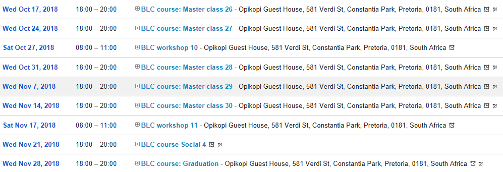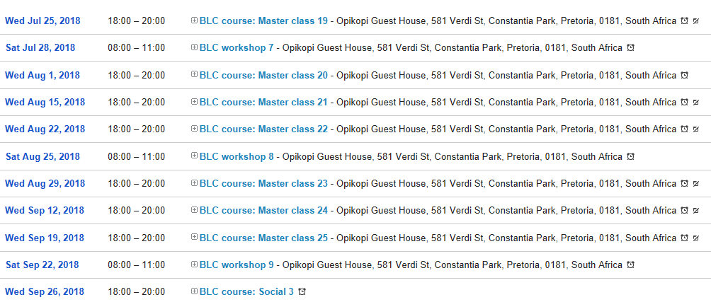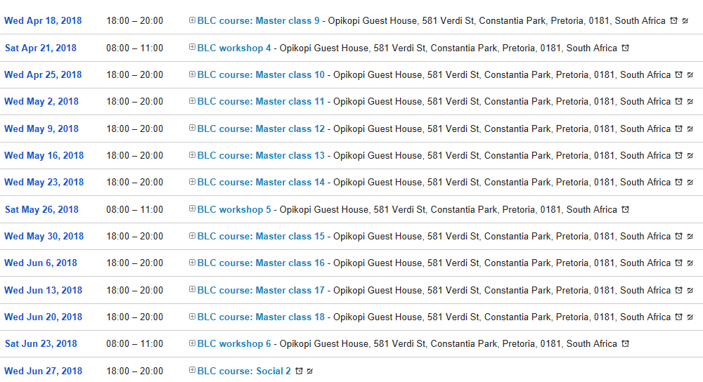 The full time course is presented in the East of Pretoria, South Africa, and consist of 6 different engagements, i.e.